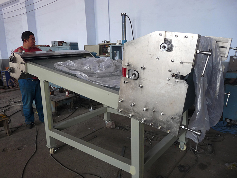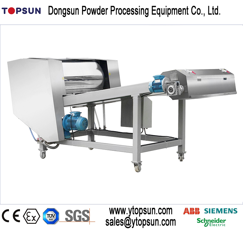 La pieza de trituración está formada por un motor de 0,75 kW (PFY-210) y un motor reductor. Los rodillos trituradores están hechos de dientes de acero que pueden triturar las escamas en trozos pequeños. Esta parte es peligrosa, se utilizan una cubierta de seguridad y un interruptor de seguridad, una vez que la cubierta está abierta, el interruptor de seguridad cortará la alimentación del motor de accionamiento. Para garantizar la seguridad, el interruptor de seguridad es de tipo abierto positivo y se combina con un relé de seguridad. El grado de protección puede ser Cat.3 según EN 954-1. La salida de la cinta de enfriamiento está protegida con una rejilla de 20 × 20 para evitar que la mano toque el rodillo triturador. La rejilla está hecha de acero inoxidable de Ф3 mm.