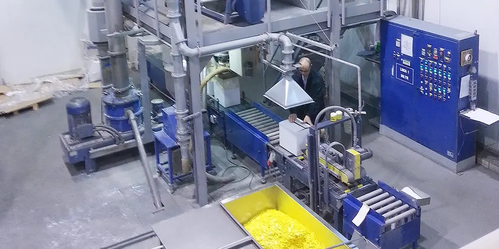 El siguiente paso en la fabricación de un recubrimiento en polvo implica reducir el tamaño de las partículas de las virutas o escamas que se han recogido de la cinta de enfriamiento. El objetivo aquí es pulverizar estas escamas en un polvo fino que posea una distribución de tamaño de partícula utilizable en el equipo de aplicación del cliente. Por lo general, esto se logra con un molino clasificado por aire.